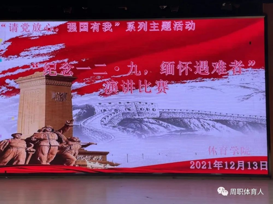 时逢第八个国家公祭日,为纪念“一二·九,缅怀遇难者”爱国运动,同时缅怀遇难同胞,激励我院学生的爱国激情,弘扬伟大的爱国精神。体育学院于12月13日以“朗诵点滴历史,演讲爱国情怀”为主题举行“纪念一二·九,缅怀遇难者”演讲比赛。